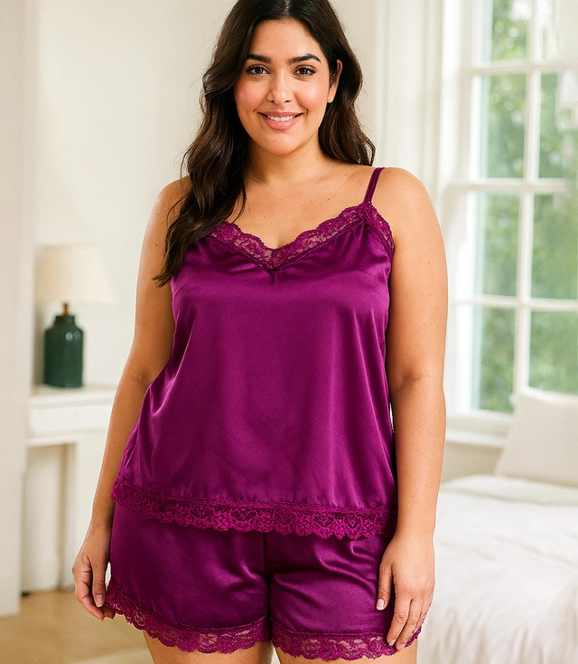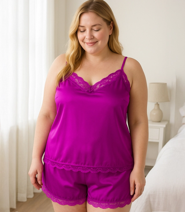 Saténový pyžamový komplet s krajkovými šortkami a spodničkou