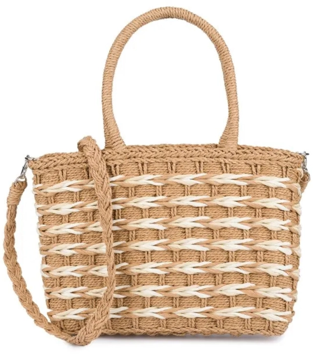 Střední košík, letní taška, tuhá kabelka, tkané rukojeti z ekokůže