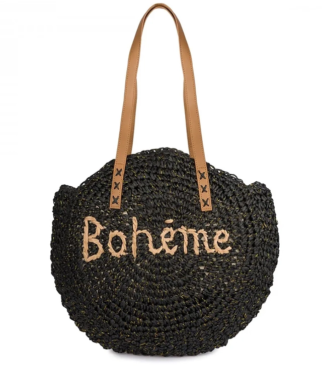Kulatá pletená boho kabelka s nápisem "Bohème"