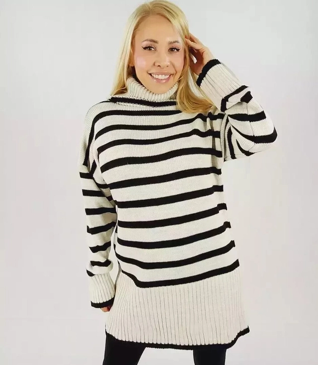 Volný dlouhý svetr s rolákem a oversize pruhy