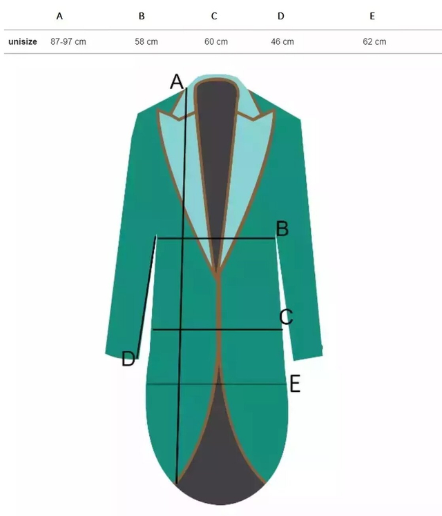 | Velikost | (A) CELKOVÁ DÉLKA | (B) ŠIROKÝ POPRSÍ (OBVOD X 2) | (C) ŠÍŘKA PÁS (OBJ. X 2) | (D) DÉLKA RUKÁVU OD PODPAŽÍ | (E) ŠÍŘKA BOKŮ (OBVOD X 2) |