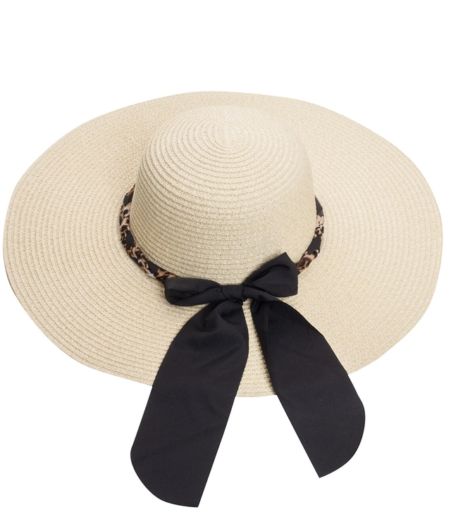Módní velký pletený klobouk s mašlí a stuhou s leopardím vzorem