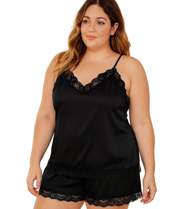 Saténový pyžamový komplet s krajkovými šortkami a spodničkou