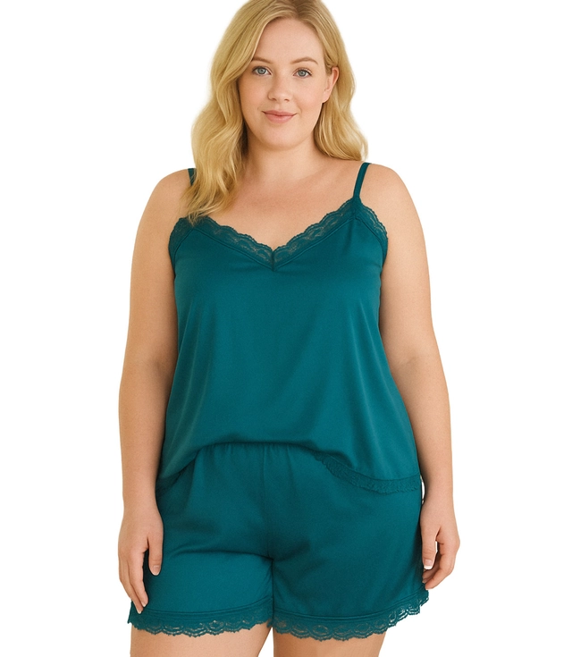 Saténový pyžamový komplet s krajkovými šortkami a spodničkou
