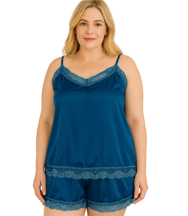 Saténový pyžamový komplet s krajkovými šortkami a spodničkou