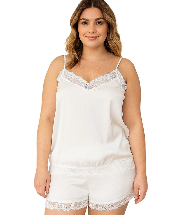Saténový pyžamový komplet s krajkovými šortkami a spodničkou