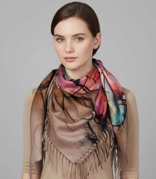 Abstraktní vícebarevná elegantní šála s třásněmi je kombinací lehkosti, stylu a pohodlí. Jeho abstraktní vzor dodá charakter každému stylu a měkká tkanina vás příjemně zahalí v chladnějších dnech. Je to módní a univerzální doplněk, který se bude hodit k ležérním i elegantním soupravám.