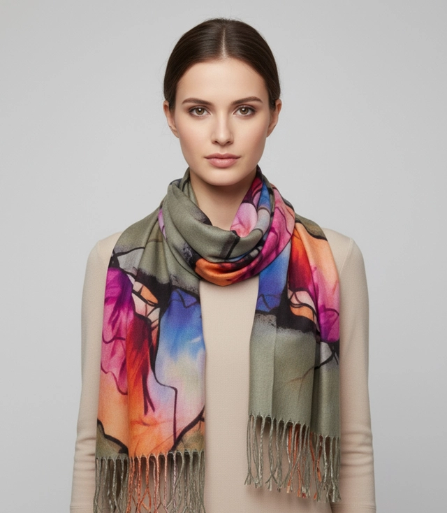 Abstraktní vícebarevná elegantní šála s třásněmi je kombinací lehkosti, stylu a pohodlí. Jeho abstraktní vzor dodá charakter každému stylu a měkká tkanina vás příjemně zahalí v chladnějších dnech. Je to módní a univerzální doplněk, který se bude hodit k ležérním i elegantním soupravám.
