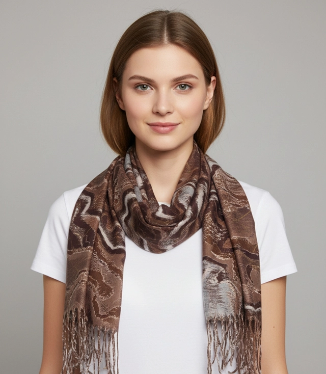 Vlnitý šátek s jemným třásňovým vzorem je ideální volbou pro ženy, které ocení kombinaci pohodlí a stylu. Jeho měkká tkanina a zvlněný vzor vytvářejí harmonický celek, který oživí každou stylizaci. Skvěle se hodí pro každodenní nošení, do práce i na procházky - podzimně-zimnímu období dodá noblesu a příjemné teplo.