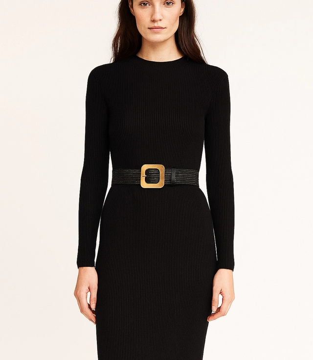 Elegantní opasek s pletenou strukturou je módním doplňkem, který krásně zvýrazní pas a dodá styl každému oblečení. Široký tvar a velká ozdobná spona vytvářejí výrazný celek, ideální k šatům, košilím nebo lehkým svetrům.