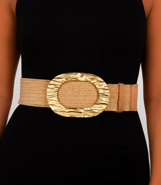Elegantní opasek s pletenou strukturou je módním doplňkem, který krásně zvýrazní pas a dodá styl každému oblečení. Široký tvar a velká ozdobná spona vytvářejí výrazný celek, ideální k šatům, košilím nebo lehkým svetrům.