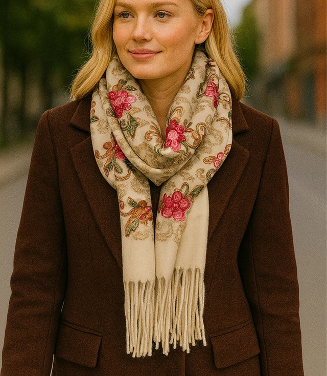 Šátek je po celé délce zdoben jemným lidovým květinovým vzorem, který upoutá pozornost a dodá stylingu etnický nádech. Ozdobné střapce podtrhují ženskost a dodávají celkovému vzhledu ležérní, boho atmosféru. Díky svým univerzálním rozměrům jej můžete nosit jako šálu na kabát, přehoz přes šaty nebo nápadnou zavinovačku na ramena.