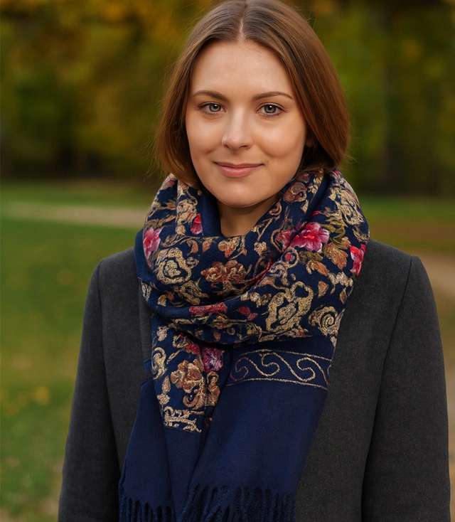 Šátek je po celé délce zdoben jemným lidovým květinovým vzorem, který upoutá pozornost a dodá stylingu etnický nádech. Ozdobné střapce podtrhují ženskost a dodávají celkovému vzhledu ležérní, boho atmosféru. Díky svým univerzálním rozměrům jej můžete nosit jako šálu na kabát, přehoz přes šaty nebo nápadnou zavinovačku na ramena.