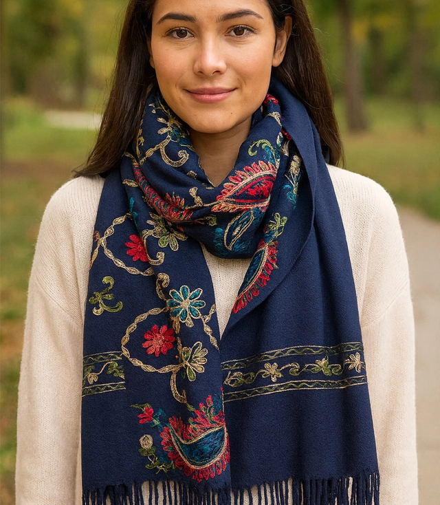 Rozměry 180 x 70 cm umožňují nosit jej různými způsoby: klasicky omotaný kolem krku, jako elegantní přehoz přes rameno nebo jako lehký zavinovací šátek, který nahradí svrchní oděv při večerních vycházkách. Třásně jemně podtrhují ženský charakter, zatímco bohatý květinový motiv s ozdobnými víry dodává celku elegantní, lehce etnický vzhled.