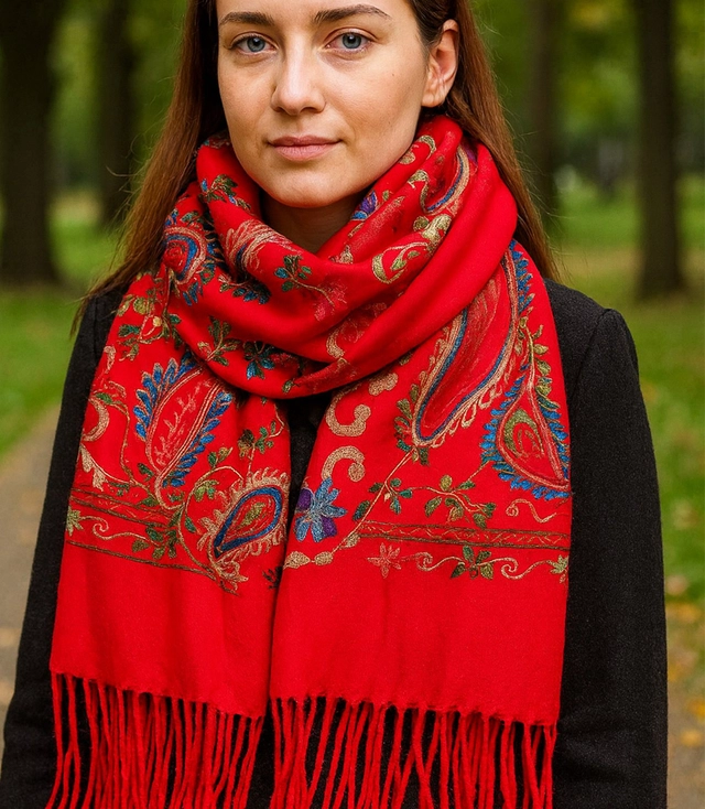 Rozměry 180 x 70 cm umožňují nosit jej různými způsoby: klasicky omotaný kolem krku, jako elegantní přehoz přes rameno nebo jako lehký zavinovací šátek, který nahradí svrchní oděv při večerních vycházkách. Třásně jemně podtrhují ženský charakter, zatímco bohatý květinový motiv s ozdobnými víry dodává celku elegantní, lehce etnický vzhled.