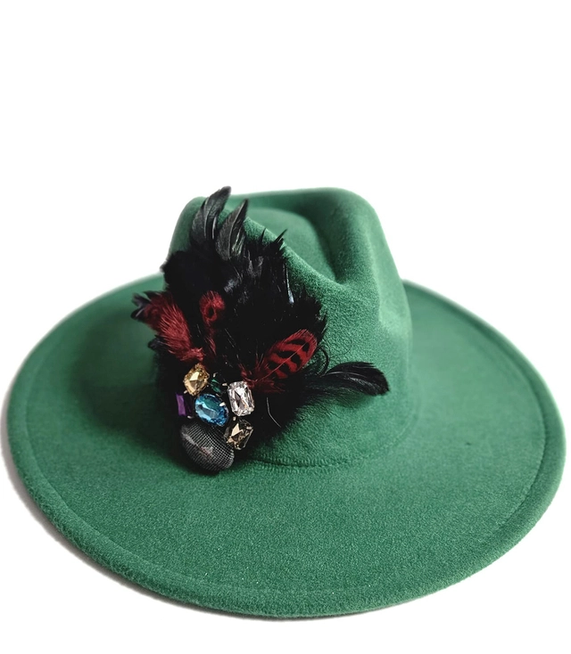 Elegantní dámský klobouk s velkou péřovou broží a barevnými zirkony