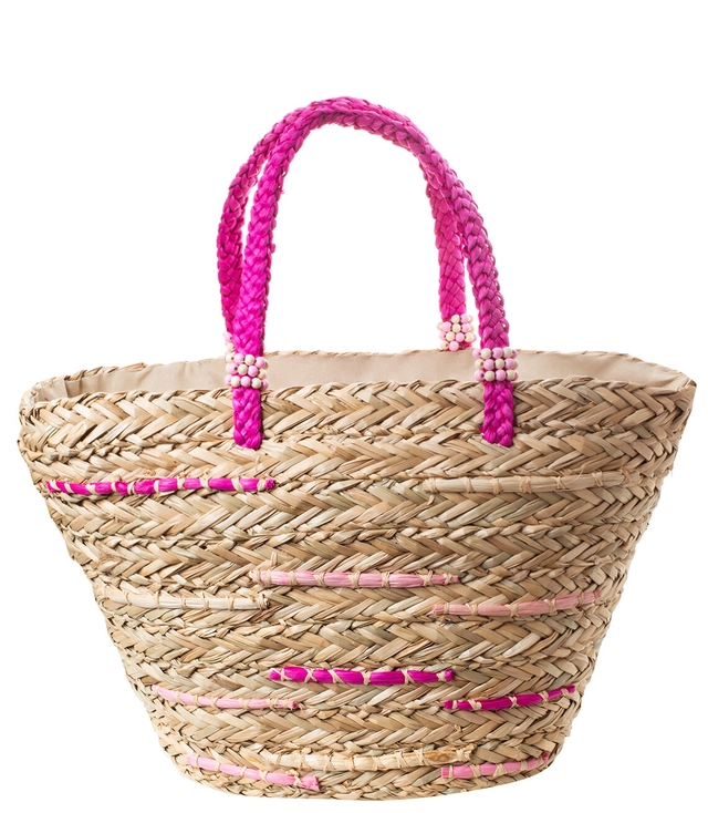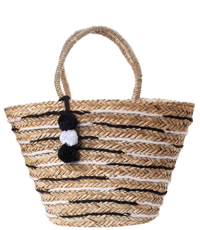 Mega velká letní taška pletený koš s podšívkou a bambulkami